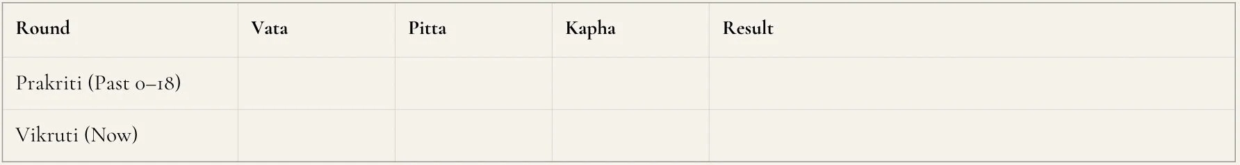 Count your letters under each dosha and identify your constitution (prakruti) and reflect your current imbalance (vikruti). Ties are common (e.g., Pitta-Vata).